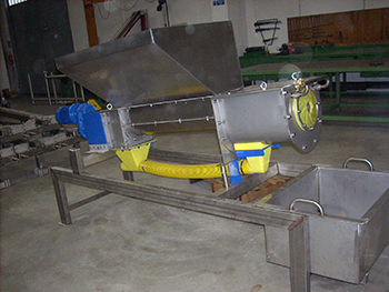 The solid material with an high water content enters the hopper and goes down until it reaches the compression chamber.